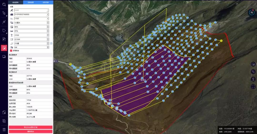 如上圖所示,為了解決這種問(wèn)題,需要專門(mén)結(jié)合地形設(shè)計(jì)一種變高航線,最大程度上做到以相對(duì)較低且一致的航高,獲取測(cè)區(qū)內(nèi)GSD相對(duì)一致的傾斜數(shù)據(jù),滿足用戶對(duì)于高精度、高分辨率的需求。