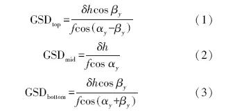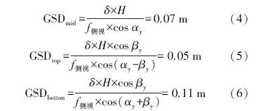 結(jié)合傾斜相機(jī)主光軸旋轉(zhuǎn)角度,由圖2可以得出傾斜影像中心點(diǎn)、近地點(diǎn)與遠(yuǎn)地點(diǎn)的大致分辨率。設(shè)傾斜影像中心點(diǎn)、近點(diǎn)和遠(yuǎn)點(diǎn)分辨率分別為GSDmid、GSDtop、GSDbotton,計(jì)算公式如下
