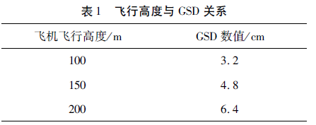 在數(shù)碼相機(jī)航攝時(shí)統(tǒng)一都使用GSD(Ground Sample Distance)概念。使用數(shù)碼相機(jī)航攝時(shí),航線設(shè)計(jì)以GSD為出發(fā)點(diǎn),先由成圖比例尺確定GSD,進(jìn)而確定航高。在高差較小的地區(qū)航攝時(shí),成圖比例尺與GSD的對(duì)應(yīng)關(guān)系如下表所示:
