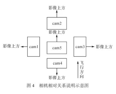 針對(duì)多鏡頭傾斜航空攝影,提交資料時(shí)需增加相機(jī)相對(duì)關(guān)系的說(shuō)明文件。以5鏡頭為例,表示了傾斜數(shù)字航攝儀各子相機(jī)的相對(duì)位置關(guān)系,同時(shí)影像上方采用箭頭標(biāo)明與飛行方向的關(guān)系。相機(jī)相對(duì)關(guān)系說(shuō)明如圖4所示。