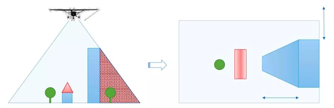 另外,當(dāng)測(cè)區(qū)建筑較高的時(shí)候,建筑屋頂會(huì)在影像中形成較大的投影差,如下圖所示,單純考慮地面物體的重疊度必然導(dǎo)致建筑屋頂出現(xiàn)漏洞,需要結(jié)合相對(duì)航高、重疊度以及建筑高度等方面的相關(guān)因素加以分析。