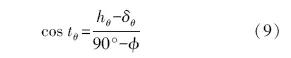式中,tθ為太陽(yáng)時(shí)角,單位為 (°);hθ為太陽(yáng)高度角,單位為 (°);δθ為攝影日期的太陽(yáng)赤緯,單位為 (°);φ為攝區(qū)的平均地理緯度,單位為 (°);Tφ為攝區(qū)地方時(shí),單位為時(shí)。