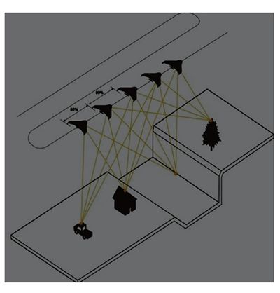 傾斜攝影技術(shù)是通過(guò)在飛行平臺(tái)上搭載多臺(tái)傳感器,同時(shí)從一個(gè)垂直、四個(gè)側(cè)視等不同角度采集影像。我們可以將它理解為一項(xiàng)進(jìn)化了的攝影測(cè)量技術(shù),它比傳統(tǒng)的攝影測(cè)量多了四個(gè)傾斜拍攝角度,從而能夠獲取到更加豐富的側(cè)面紋理等信息。