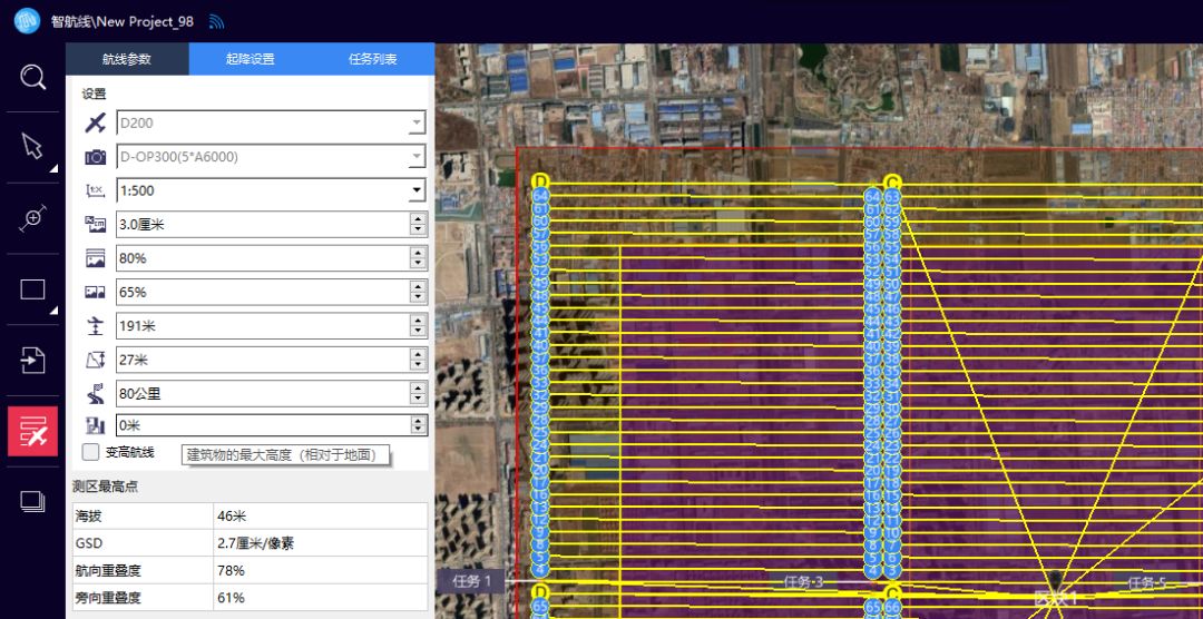 我們?cè)谶M(jìn)行航線設(shè)計(jì)的時(shí)候?qū)⒔ㄖ叨纫牒骄設(shè)計(jì)中,尤其是引入進(jìn)傾斜航線設(shè)計(jì)中,在進(jìn)行航線設(shè)計(jì)的過(guò)程中輸入測(cè)區(qū)的最高建筑的高度,通過(guò)調(diào)整重疊度,尤其是旁向重疊度,以達(dá)到測(cè)區(qū)最高點(diǎn)以及最高建筑頂部的重疊度都能滿足要求,這種航線設(shè)計(jì)的對(duì)策對(duì)于保證數(shù)據(jù)的有效獲取,避免模型出現(xiàn)漏洞具有明顯的優(yōu)勢(shì)。