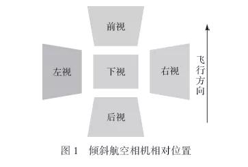 傾斜航攝儀集成一個(gè)下視相機(jī)和多個(gè)傾斜相機(jī),中央一個(gè)垂直對(duì)地觀測(cè),獲取垂直影像,于該相機(jī)4個(gè)正交方位分別以一定的傾角放置一個(gè)相機(jī)。