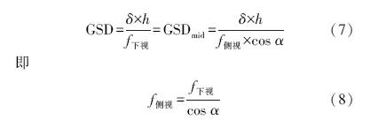 式中,α為傾角。當(dāng)傾角設(shè)置為45°時(shí),一般情況下側(cè)視相機(jī)的焦距宜為下視相機(jī)焦距的1.4倍。因此,傾斜攝影時(shí)一般選用側(cè)視相機(jī)的焦距比下視相機(jī)的焦距要長(zhǎng)。