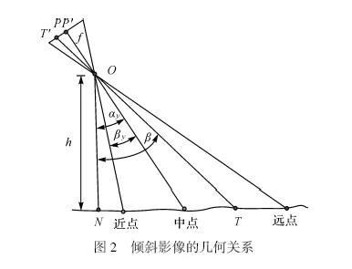 式中,δ為CCD單像元大;h為飛行高度;f為相機(jī)焦距;αy為傾角;βy=arctan (b/f) 為視場(chǎng)角的一半。傾斜影像的幾何關(guān)系如圖2所示。