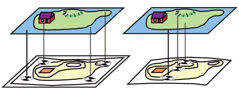 像控點(diǎn)的布設(shè)的好壞對(duì)后期成圖起著相當(dāng)關(guān)鍵的作用,首先,每個(gè)架次的至少需要5 個(gè)相控點(diǎn)。若遇到地形起伏變化較大,數(shù)目植被復(fù)雜地區(qū)需加密像控點(diǎn)(圖1),若不加密或者分布不均勻覆蓋飛行區(qū)域時(shí),會(huì)導(dǎo)致翹曲(圖2)、導(dǎo)致平差數(shù)據(jù)不能達(dá)到精度要求。
