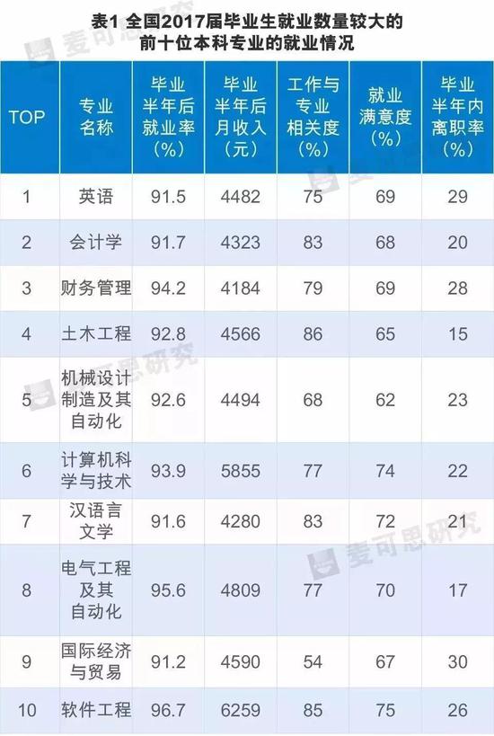 麥可思最新數(shù)據(jù)顯示,2017屆畢業(yè)生就業(yè)數(shù)量較大的十個(gè)本科專業(yè)分別是:英語(yǔ)、會(huì)計(jì)學(xué)、財(cái)務(wù)管理、土木工程、機(jī)械設(shè)計(jì)制造及其自動(dòng)化、計(jì)算機(jī)科學(xué)與技術(shù)、漢語(yǔ)言文學(xué)、電氣工程及其自動(dòng)化、國(guó)際經(jīng)濟(jì)與貿(mào)易、軟件工程。