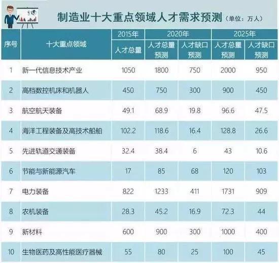 在2017年2月,教育部、人力資源和社會(huì)保障部、工業(yè)和信息化部聯(lián)合印發(fā)了《制造業(yè)人才發(fā)展規(guī)劃指南》,對(duì)制造業(yè)十大重點(diǎn)領(lǐng)域的人才需求做出一個(gè)預(yù)測(cè)。