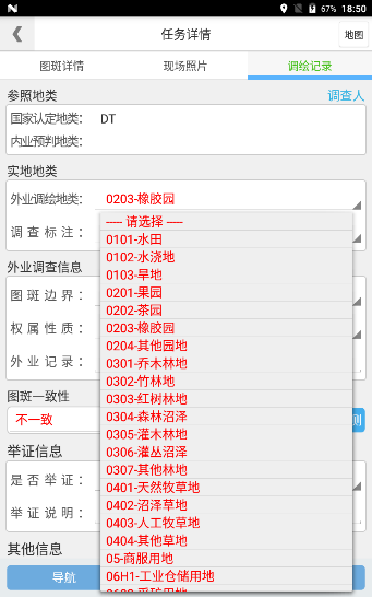 根據(jù)三調(diào)性質(zhì)設(shè)計,點擊圖斑屬性,在外業(yè)調(diào)繪選擇項目下,只有地類判別一個是必需要選擇的。其他的完全根據(jù)自己的需求進行選擇,不選擇絕不影響后面的操作。舉證直接點擊現(xiàn)場照片功能,按照界面提示對應(yīng)拍照即可。外業(yè)操作學(xué)習(xí)一目了然。
