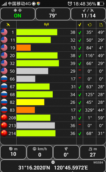 圖中顯示手機已經搜索到北斗衛(wèi)星