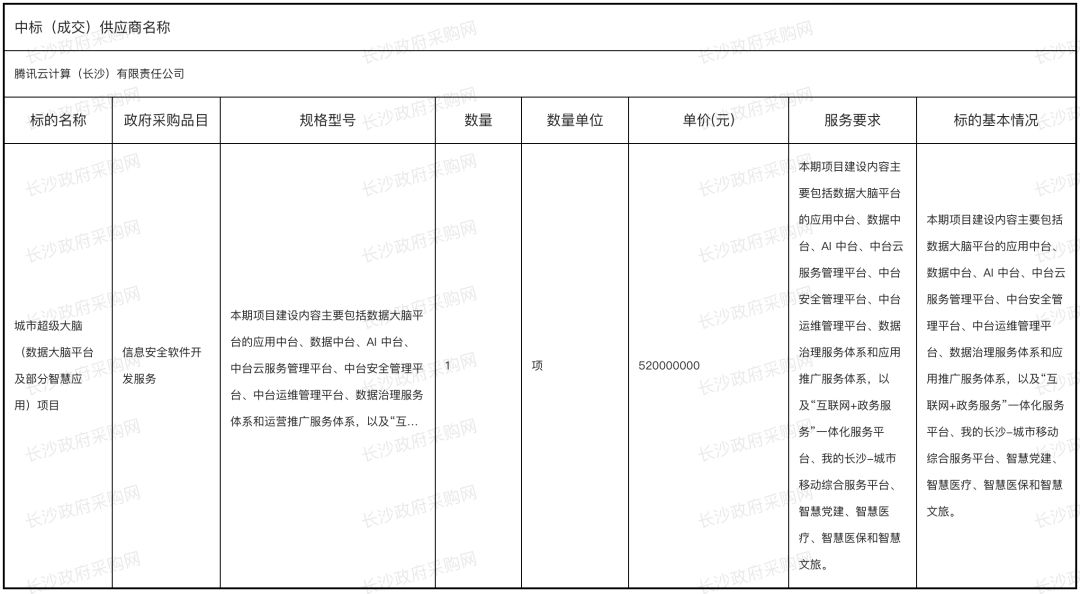 6月28日,長沙政府采購網(wǎng)發(fā)布《長沙市人民政府電子政務管理辦公室城市超級大腦(數(shù)據(jù)大腦平臺及部分智慧應用)項目》成交公告: