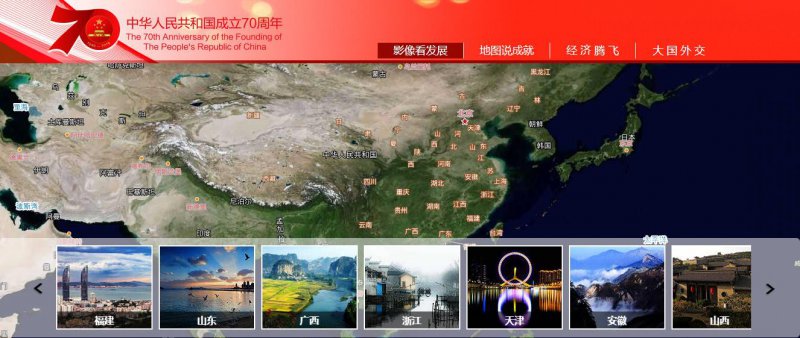 基于天地圖的中華人民共和國成立70周年專題頻道正式上線(http://www.tianditu.gov.cn/xzgcl70/)。頻道以天地圖在線地理信息資源為基礎(chǔ),通過“影像看發(fā)展”“地圖說成就”“經(jīng)濟(jì)騰飛”“大國外交”四個(gè)欄目直觀展示了新中國成立70年來的巨大變化,用地圖的方式慶祝中華人民共和國成立70周年這一偉大歷史時(shí)刻的到來。